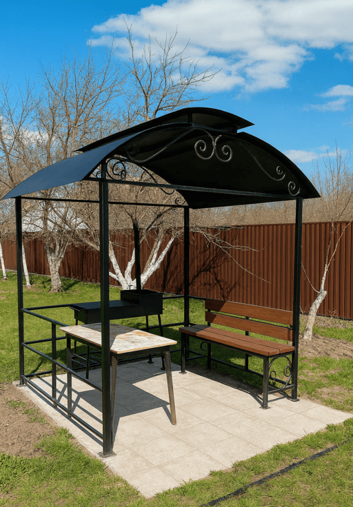 - Размер и форма: навес под мангальную зону изготавливается по соответствующим размерам — цена зависит от площади и особенностей размещения.