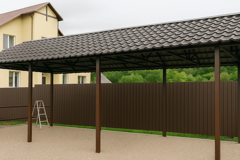 Процесс строительства навеса из металла включает несколько ключевых этапов: